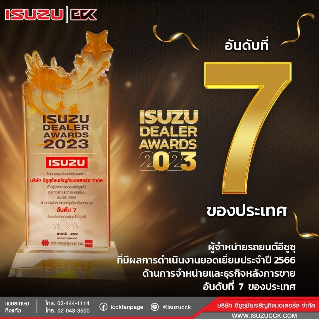การันตีคุณภาพงานขายและบริการหลังการขาย ด้วยรางวัล ISUZU DEALER AWARDS 2023 ผู้จำหน่ายรถยนต์อีซูซุที่มีผลการดำเนินงานยอดเยี่ยมประจำปี 2566 อันดับที่ 7 ของประเทศ